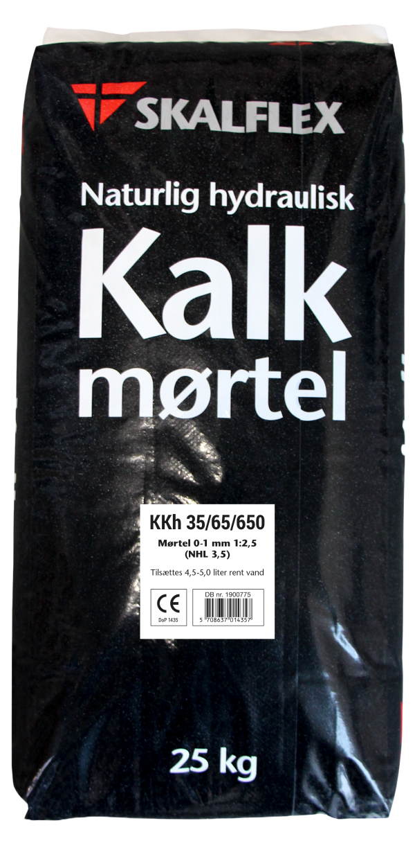 Skalflex KKh Mørtel (NHL 3,5) 35/65/650 0-1 mm 1:2,5 er en fabriksfremstillet, hydraulisk mørtel, der kun skal tilsættes vand før brug. Indeholder NHL3,5 naturlig hydraulisk kalk, 0-1 mm ovntørret kvartssand og kalkfiller.