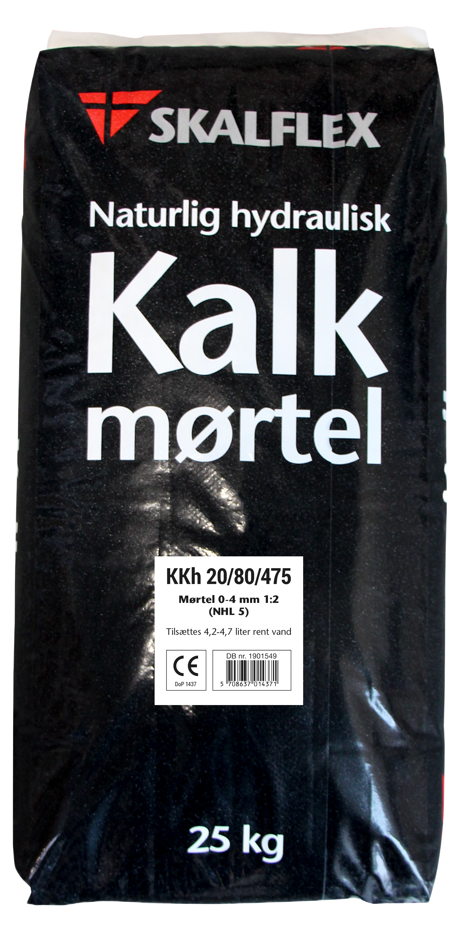 Skalflex KKh Mørtel (NHL 5) 20/80/475 0-4 mm 1:2 er en fabriksfremstillet, hydraulisk mørtel, der kun skal tilsættes vand før brug. Indeholder NHL5 naturlig hydraulisk kalk, 0-4 mm ovntørret kvartssand og kalkfiller.